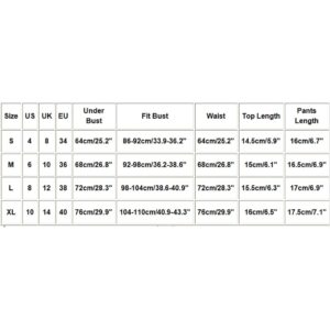 Size US UK EU Under Bust Fit Bust Waist Top Length Pants Length S 4 8 34 64cm/25.2″ 86-92cm/33.9-36.2″ 64cm/25.2″ 14.5cm/5.9″ 16cm/6.7″ M 6 10 36 68cm/26.8″ 92-98cm/36.2-38.6″ 68cm/26.8″ 15cm/6.1″ 16.5cm/6.9″ L 8 12 38 72cm/28.3″ 98-104cm/38.6-40.9″ 72cm/28.3″ 15.5cm/6.3″ 17cm/6.9″ XL 10 14 40 76cm/29.9″ 104-110cm/40.9-43.3″ 76cm/29.9″ 16cm/6.5″ 17.5cm/7.1″